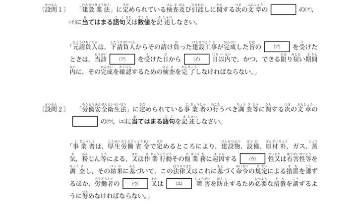 一方、午後の部(2時間)の前半では、施工管理法に関する知識を問う問題が出題され、後半では法規に関する知識を問う問題が出題されます。