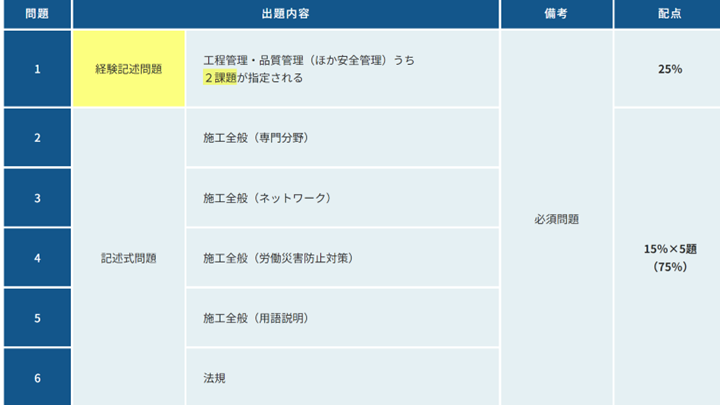 特に施工経験記述は配点が高く、しっかりと時間をかけて取り組む必要があります。